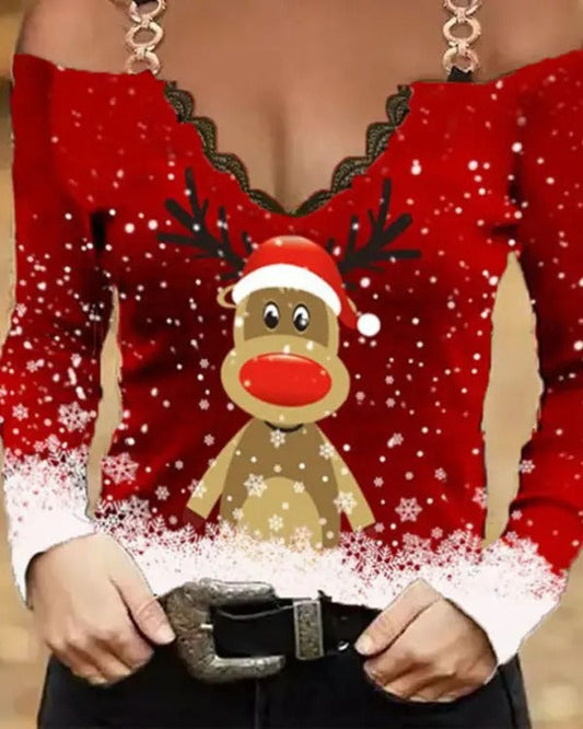 Christmas Print Lace Trim Chain Strap Cold Shoulder Top