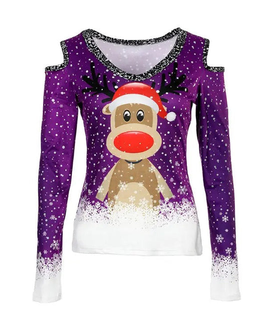 Christmas Snowflake Elk Print Cold Shoulder Top