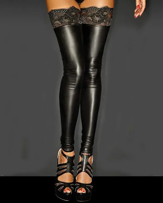 Solid Color Splicing Lace Lacquered Leather Skinny Stockings