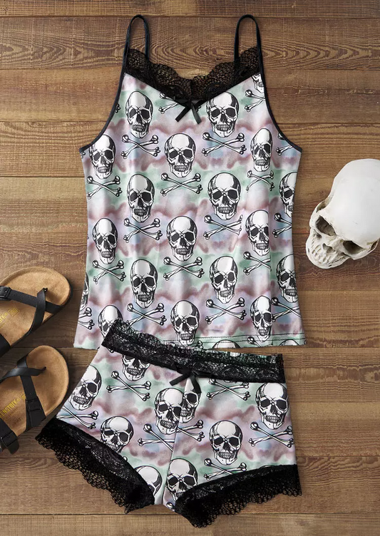 Halloween Skull Tie Dye Lace Camisole And Shorts Pajamas Set