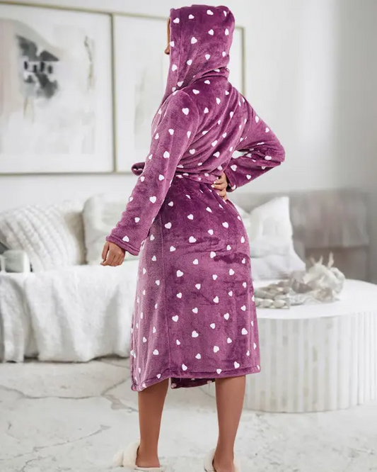 Fuzzy Heart Print Tied Detail Hooded Robe