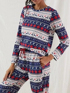 Plus Size Women Christmas Allover Snowflake Elk Printed Crew Neck Comfy Drawstring Pants Pajamas Set With Pocket