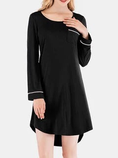 Plus Size Women Cotton Plain Long Sleeve High Low Hem Nightdress Pajamas With Pocket