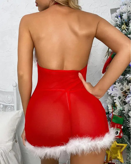Christmas Halter Sheer Mesh Lace Fluffy Hem Babydoll