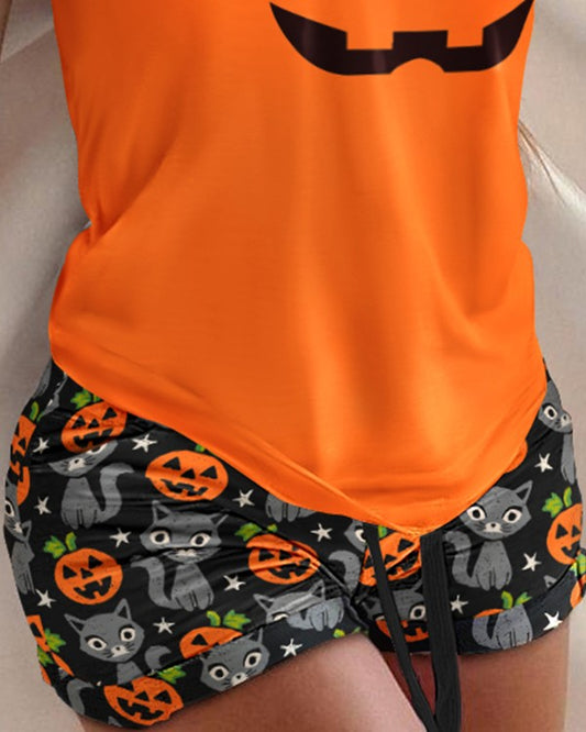 Halloween Pumpkin Cat Print Drawstring Pajamas Set